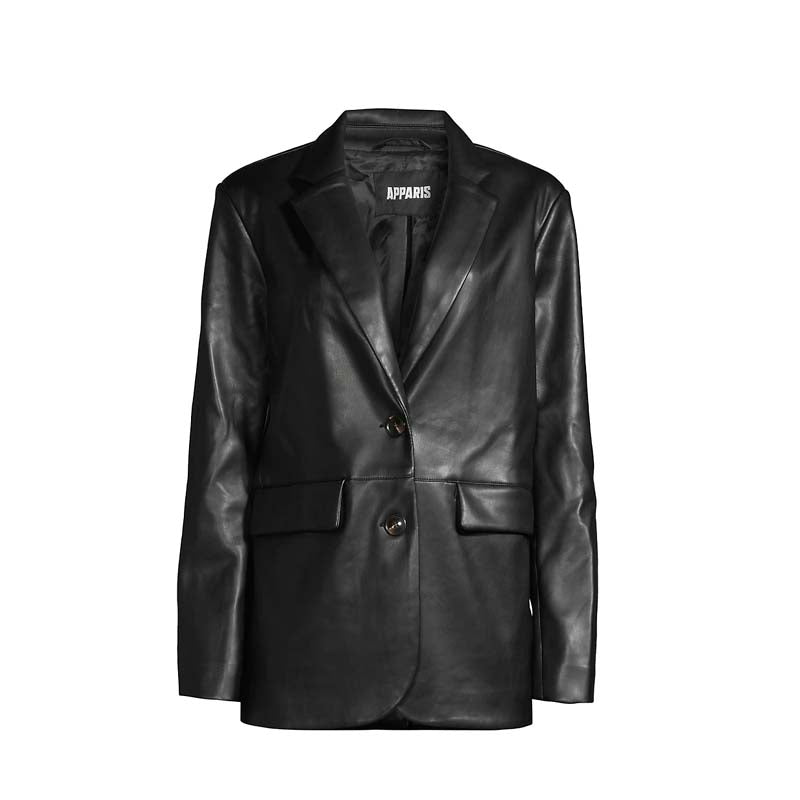 Crafted of faux leather, the Killian blazer by Apparis features a slender notched lapel, long sleeves, and dual flap pockets.