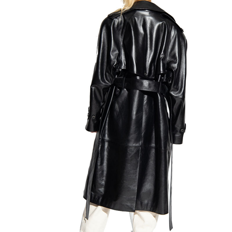 Black trench coat from The Mannei. Crafted from leather with a double-breasted silhouette, this style features button fastenings, an attached waist-cinching belt, a buttoned collar with notch lapels, shoulder epaulettes, a storm flap, two flapped pockets, a single back vent and long sleeves with button straps on the cuffs.