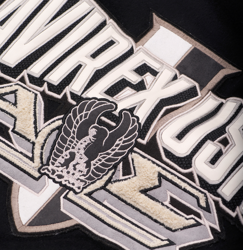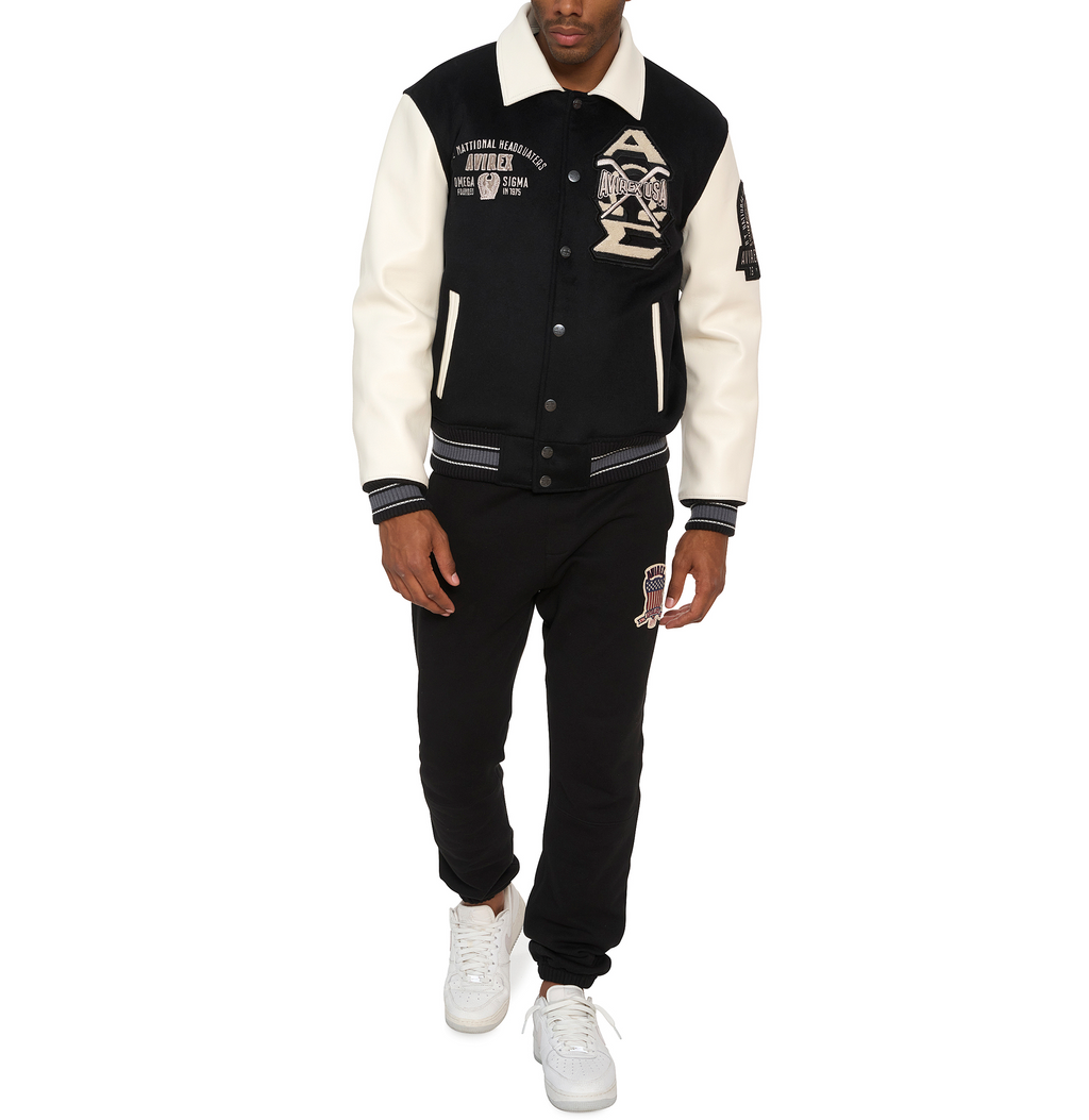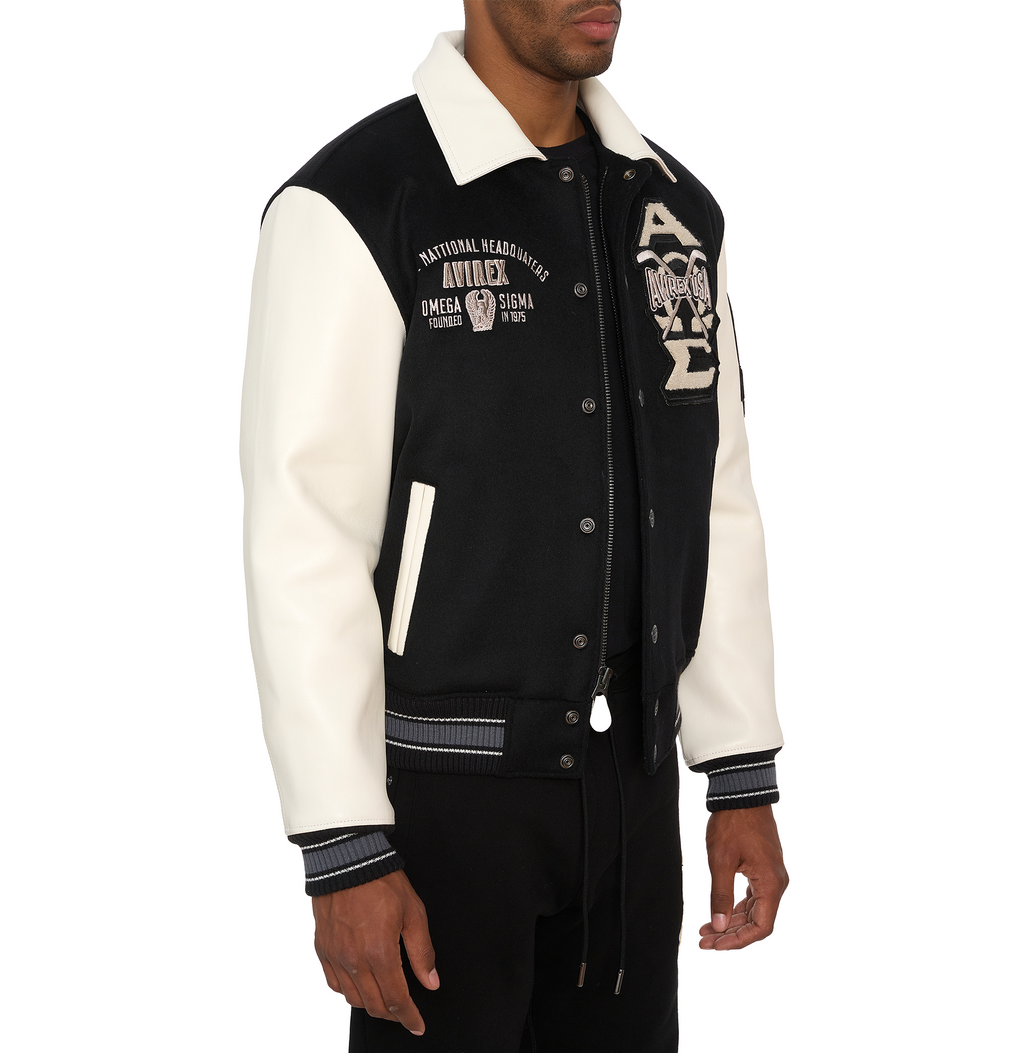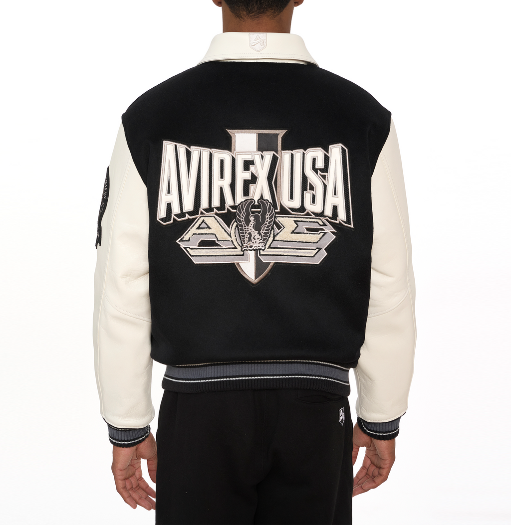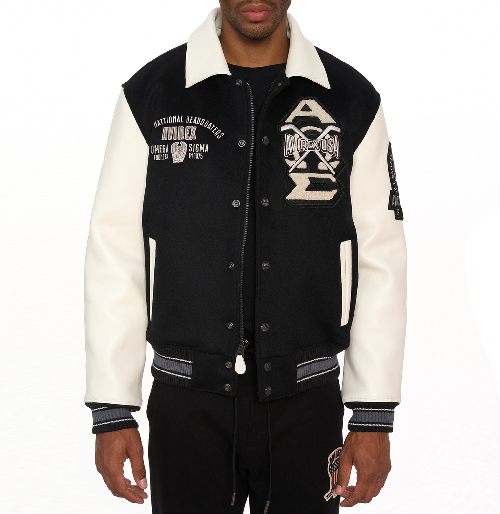 Avirex varsity jacket with antique European lamb leather sleeves and merino wool body. Designed with chenille omega signa and Avirex patch art and textured hockey art embroidery.