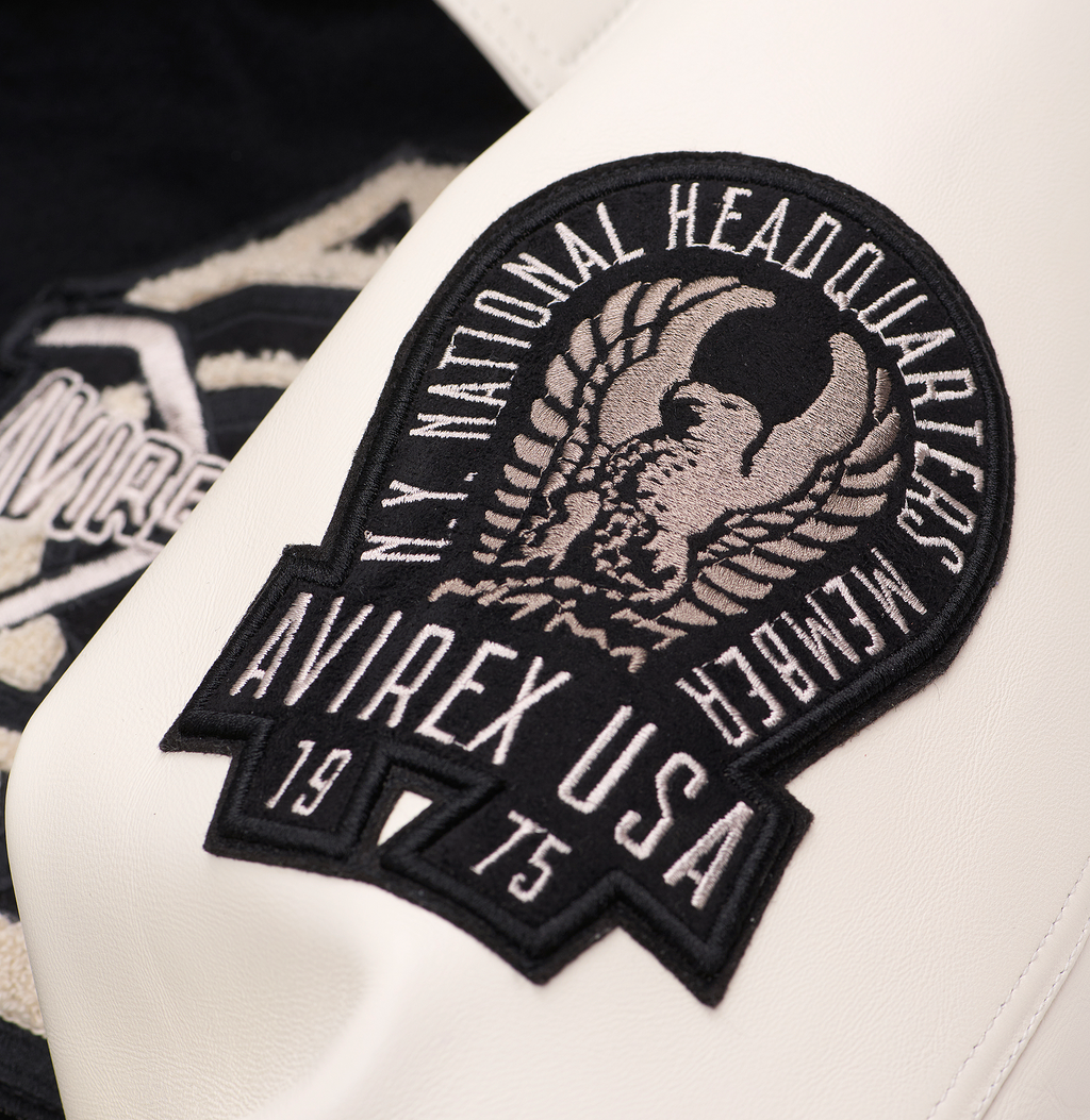 - Embroidered chenille patch at chest and Avirex “A” crest patch on sleeve